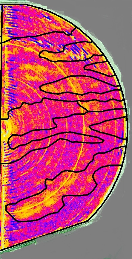 Below is a picture of a zone sample created with grain harvest data. Bring us your yield monitoring data to see how we can do this for you.